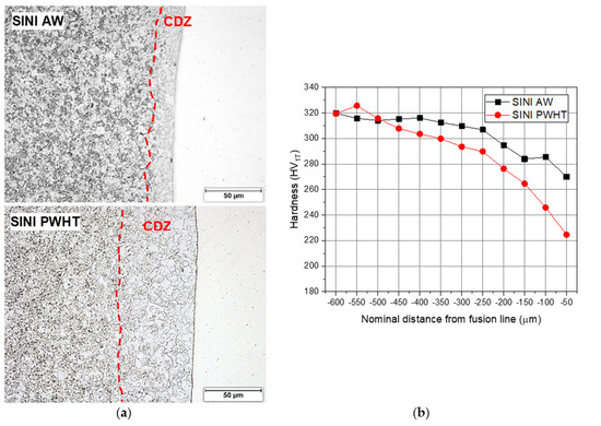(a) Optical images of the SA 508/Alloy 52 weld metal interface in SINI AW and SINI PWHT, with (b) the corresponding hardness profiles, showing the widening of the CDZ upon PWHT.