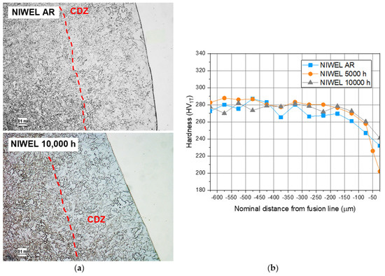 (a) Optical images of the SA 508/Alloy 52 weld metal interface in NIWEL AR and NIWEL 10,000 h, with (b) the corresponding hardness profiles, showing the CDZ resulting from PWHT and no influence of thermal ageing.