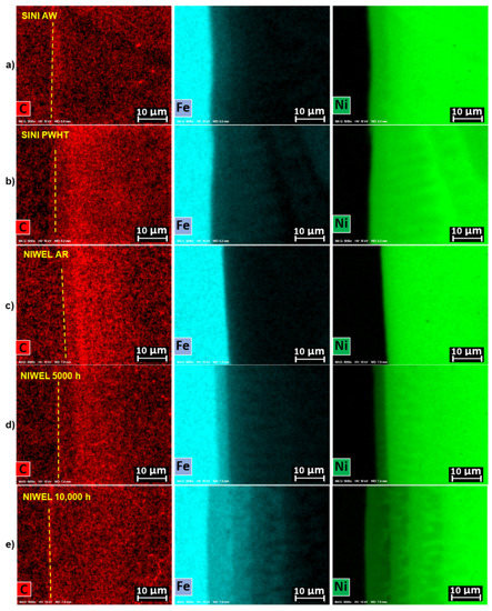 As seen in Figure 10, the direct effect of the widening of the CDZ upon PWHT is revealed in the weld metal side of the interface. A carbon-rich layer forms in Alloy 52 weld metal close to the FB in SINI PWHT condition. As expected, the similar carbon-rich layer is found in NIWEL AR material. However, as observed in NIWEL 5000 h and NIWEL 10,000 h samples, thermal ageing results in the progressive decrease of the carbon-rich layer and its shift away from the fusion line. In parallel, thermal ageing clearly enhances the iron diffusion from the LAS to the weld metal.