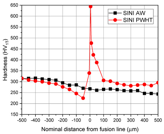 Comparison of the microhardness (350 mN) profiles of SINI AW and SINI PWHT at the LAS/Alloy 52 weld metal interface.