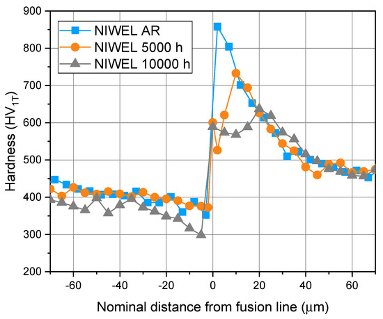 Comparison of the microhardness (350 mN) profiles of NIWEL AR, NIWEL 5000 h and NIWEL 10,000 h at the LAS/Alloy 52 weld metal interface.