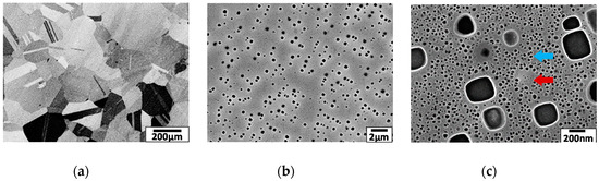 AD730TM microstructure after the heat-treatment routine applied: (a) Coarse-grained microstructure (SEM, BSE); (b) γ′ precipitation: cubical γ′ precipitates (SEM-FEG, SE); (c) γ′ precipitation: cubical γ′ precipitates, spherical secondary (blue arrow) and tertiary (red arrow) γ′ precipitates (FEG-SEM, SE).