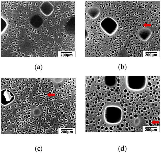 γ′ evolution during strain-free aging at 750 °C with coalescing particles indicated by red arrows (FEG-SEM): (a) 0 h; (b) 144 h; (c) 262 h; (d) 429 h.
