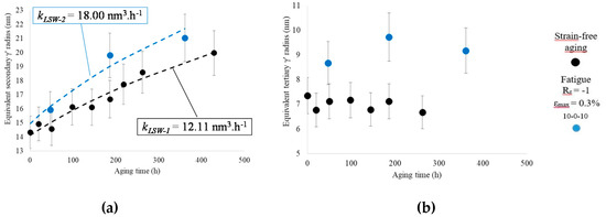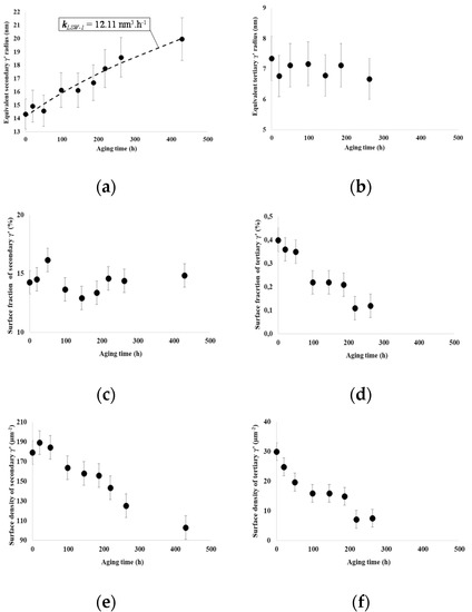 Variations with aging time of the secondary and tertiary γ′ sizes are presented in Figure 4a,b, respectively. The secondary γ′ radius increases with time, following a LSW equation in the form [17,18]: