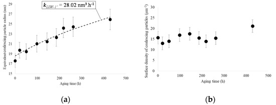 The coalescing particles are also analyzed. Coalescing particles are already present in the initial microstructure because of the heat treatment procedure applied. The evolutions of their equivalent mean radius and surface density are presented in Figure 5. Examples of coalescing particle morphology can be found in Figure 2. The mean radius increases with time, but the surface density remains constant. A LSW equation is fitted to the evolution of coalescing particle sizes in Figure 6a, resulting in a kinetic coefficient kLSW-1′ = 28.00 nm3·h−1.