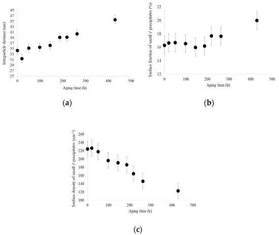 When the three different γ′ populations are considered—γ′II, γ′III, and coalescing γ′—the overall surface fraction of γ′ tends to increase while the surface density decreases as it is shown in Figure 6. In Figure 6a is reported the evolution of the inter-particle distance between all the γ′ precipitates. The inter-particle distance increases steadily, accounting for the dissolution of tertiary γ′. A singular decrease is though observed at 20 h, maybe due to a small period where a fine γ′ population reprecipitates because of supersaturation of the matrix.