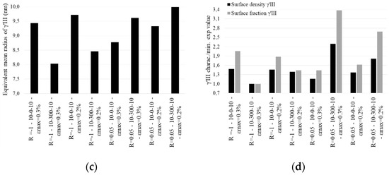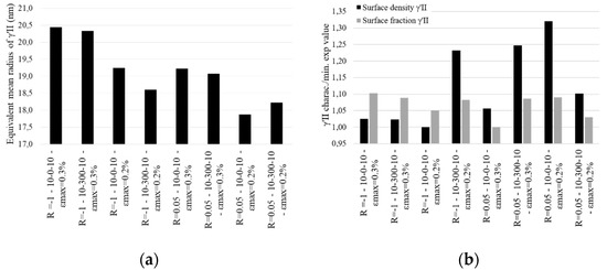 The variations in the characteristic values of coalescing particles are studied. In Figure 10a,b, the equivalent mean radiuses and the surface fractions for every aging condition are reported. Most of the fatigue conditions lead to an increase of the size of coalescing particles compared to the strain-free aging condition. As it is shown Figure 10c, the fatigue tests leading to the highest size increases are the 10-0-10 ones. The particle coarsening increase can be as high as 14% for the 10-0-10 condition at Rε = 0.05 and εmax = 0.2%. A LSW equation can be fitted to the variation of coalescing particle size during the tests with Rε = −1 and εmax = 0.2%: the growth kinetics of the LSW equation obtained is kLSW-2′ = 39.48 nm3.h-1. In Figure 10b,d, it can be seen that the surface densities vary according to the strain cycling conditions. Indeed, the 10-0-10 tests lead to lower surface densities while the 10-300-10 tests result in much higher surface densities with increases as high as 40% compared to the strain-free results.