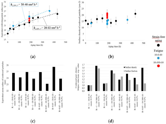 Evolution of coalescing particle: (a) radius; (b) surface fractions; after strain-free aging (black), fatigue tests with 10-0-10 cycles (blue) and 10-300-10 cycles (red). Comparison of the particle characteristics between the different 186 h fatigue test conditions: (c) mean radius; (d) surface fraction and density.