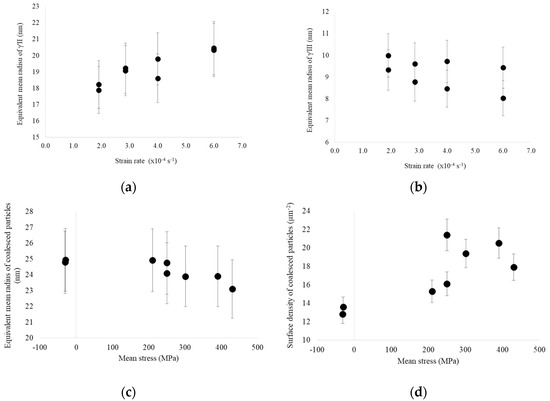 Figure 11. Evolution during the 186 h fatigue tests of the equivalent mean radiuses with the strain rate of: (a) γ′II and (b) γ′III. Evolution during the 186 h fatigue tests: (c) of the equivalent mean radiuses; (d) surface densities of coalescing particles with the mean stress. - Figure 11c,d deal with coalescing particles: they respectively show the decrease in mean size and the increase in surface fraction as a function of the mean stress during the 186 h fatigue tests. The mean stress used is the averaged value over time. Regarding the dwell-fatigue conditions, since 94% of the test duration is spent at maximal stress, the mean stress is considered to be the average maximal stress throughout the test.