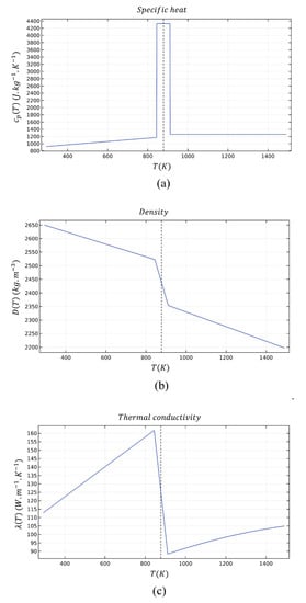 As was mentioned above, thermophysical characteristics of the material are computed via polynomial coefficient. The value of each parameter was calculated as function of temperature using COMSOL Multiphysics; these diagrams are shown in Figure 1. In addition, in order for the phase change in the mushy zone to be considered, the heat capacity method is solved by encompassing the latent heat () of the base metal [19]. By doing so, the modified specific heat can be calculated in the mushy zone between the solidus and liquidus temperatures of the material , which is about 67 K; in this region, average melting temperature is defined to be 877.5 K approximately [20] (Equation (1)).