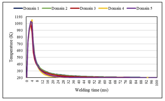 The substrate with the width of 10 mm, the length of 10 mm, and the height of 2.5 mm is involved in the thermal modeling. In general, it should be mentioned that the dimension of actual substrate that is used for the laser welding process is larger than the domain considered for simulation. Nevertheless, the thermal model simply plays a role as a heat container in the welding process; the serious thermal involvement happens adjacent to the upper part of the substrate and decreases abruptly with shifting to the bottom [21]. It was verified with a domain size independence test that the calculation domain is appropriate to not influence the temperature regime during the welding process, while restricting the computational load. To do so, five kinds of domains were used to validate the domain size independence. These were 10 × 10 × 2.5 mm3, 8 × 8 × 2 mm3, 6 × 6 × 1.5 mm3, 4 × 4 × 1 mm3, and 2 × 2 × 1 mm 3, as domains 1 to 5, respectively. As shown in Figure 2, the temperature variation at point (5, 0, 2.5), as the initial point of laser beam with an average power of 80 W focused on the substrate, was extracted. The difference between these five domains is less than 1%. Therefore, domain 1 was selected for this calculation to reduce the computational cost and time. However, this issue should be taken into account that by increasing the heat input of laser beam, the molten depth can be larger than the height of the substrate determined in the thermal model. Therefore, if the molten depth becomes larger than the domain used in the thermal modeling, the height of the domain needs to be changed with regards to the molten depth. However, in order for the computational cost and time to be decreased with regards to the molten depth and width, which were the main concentration in the present study, a domain with 2.5 mm height was prepared. Additionally, natural convection within a liquid melt pool is neglected in the thermal calculation. By doing so, the molten pool temperature is supposed to be higher than its temperature in real experiments; however, this would affect the solidification process very little from the molten pool boundary in which phase transformation and heat conduction occur [22]. Equation (2) illustrates the distribution mode of laser beam power, which is considered to be Gaussian. In this equation, is the initial point of the laser beam focused on the substrate, which is equal to (5, 0). Moreover, it should be noted that a pulsed Nd:YAG laser was utilized in the present study; therefore, it has a pulse duration and frequency with which the on-time and off-time of the laser beam can be determined. According to the parameters in Table 2, the pulse duration and frequency are 4 ms and 10 Hz, respectively. This means the laser beam is activated for 4 ms and then deactivated for 96 ms. In this regard, there should be 10 pulses in a second of the laser welding process (the time length from a pulse to the next pulse is around 100 ms). To consider the pulse mode of the laser beam, a step function is defined in which its value is 1 when the laser is active; on the other hand, its value is 0 when the laser beam is off. This function , which is dependent on time of the welding process t, is shown below as Equation (3).