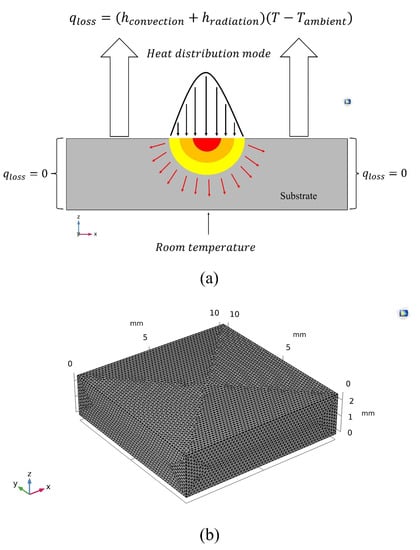 In this equation, is supposed to be the coefficient for radiative heat transfer, is a constant coefficient known as the Stefan–Boltzmann constant, is the coefficient for emission of the substrate, and is considered to be the ambient temperature; these parameters are reported to be 5.67 , 0.022, and 293 K, respectively [24,25].