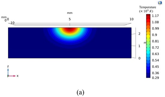 According to Equation (5), is the base material starting temperature, is the thermal conductivity, is the welding velocity, is the thermal diffusivity, and is the function that was previously described in Equation (3). It should be taken into account that in Equation (5), the welding is performed in the direction of the -axis; so, to perform welding velocity and time in the equation, is substituted by ; r is the distance of any point on the substrate from the laser beam, which can be computed by . As discussed before, materials’ properties are not the functions of temperature while using in the analytical solution. As a result, the properties mentioned in Table 4 are used in the analytical Rosenthal equation to predict the thermal behavior of the material in laser welding.