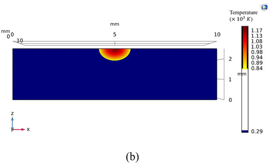 (a) Transverse-section (x-z) of the heat transfer; (b) molten pool achieved from the numerical modeling using an average laser power of 80 W, welding speed of 2 mm.s−1, and absorptivity of 0.36 at t = 4 ms.