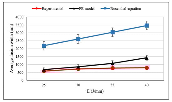 Fusion widths obtained from experiments are compared with the estimated ones from the numerical modeling and the analytical method. This comparison is illustrated in Figure 5. The average fusion widths were measured from three different transverse sections perpendicular to the welding direction for each heat input. Based on these results, it is observed that fusion widths achieved from the numerical modeling are consistent with those from experiments up to an energy density of 30 . By approaching higher energy densities, the predicted fusion widths tend to overestimate the average fusion widths obtained from experiments. However, there is a gap between the results from the analytical method and ones from experiments; obviously, fusion widths achieved from the Rosenthal equation are bigger than those from experiments. It is apparent that the results from Rosenthal equation are not matched with the experimental results due to some of selected assumptions described in Section 3. According to the FE models, natural convection within the molten pool is neglected so that in smaller melt pools, the temperature is overestimated, compared with genuine melt pools. Therefore, radiation losses are increased in smaller fusion welds. In contrast to this idea, based on the assumptions for the analytical Rosenthal equation, radiation losses are not involved in this method; therefore, fusion widths attained from the analytical method are larger than those from the numerical modeling and experiments.