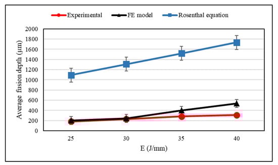 Fusion depths obtained from experiments are compared with the estimated ones from the numerical modeling and the analytical method. This comparison is demonstrated in Figure 6. The average fusion depths were measured from three different transverse sections perpendicular to the welding direction for each heat input. According to these results, it is apparent that fusion depths achieved from the numerical modeling are consistent with those from experiments up to an energy density of 30 . By approaching higher energy densities, the predicted fusion depths incline to overestimate the average fusion depths obtained from experiments. On the other hand, the predicted results from the Rosenthal equation seem to overestimate the average fusion depths attained from the experiments. The main reason may lie in the assumptions of the Rosenthal equation. As discussed above, there is no convection during the simulation of the welding process such that the results can be overestimated. Furthermore, the radiative losses might be too high especially for smaller melt pools; therefore, the predicted results might be inaccurate. In contrast, in the analytical method, radiation losses and natural convection are not considered with which the predicted results could be overestimated in comparison to the predictions from FE modeling and the experimental results.