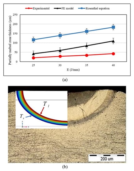 - With regards to the partially melted zone, the FE model is slightly larger than the experimental results at the heat input of 25 J · mm−1. However, by increasing the heat input, the discrepancy between the results achieved from the numerical modeling and the results from experiments becomes wider. On the other hand, the Rosenthal equation overestimates the partially melted zone in comparison to the FE model and the experiment; this could be a result of assumptions with which heat losses as well as latent heat of the material are supposed to be neglected.