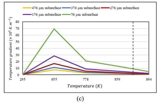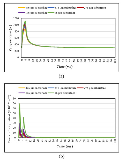 As to the numerical modeling, it is also of paramount importance that the fusion depth of solidified welds needs to be determined to evaluate the heat transfer behavior within the molten pool. Then, temperature-dependent parameters including temperature gradient and cooling rate are calculated at different points within the melt pool. In order for this case to be clearer, conceive an example of a laser beam with an average power of 80 W, welding velocity of 2 , and an absorption coefficient of 0.36. Performing these laser parameters, the obtained fusion depth using the numerical modeling is 576 . Temperature and temperature gradient, as thermal properties of the welded material, are computed in five different points from the bottom of the weld pools to the centerline: 76, 176, 276, 376, and 476 . By doing so, Figure 8a–c is attained in which the temperature and the temperature gradient in the direction of the axis z- are illustrated as functions of time and temperature, respectively. It is worthwhile to mention that the average amount of the temperature gradient is taken into account for the melting point and compared with the results obtained from the analytical method. For determining the solidification rate within the molten pool, the cooling rate is measured in the same way as the temperature gradient which was discussed before. Then, the temperature gradient and the cooling rate obtained from the numerical modeling are used in Equation (12), and ultimately, the values of the solidification rate are attained for different locations within the melt pool.