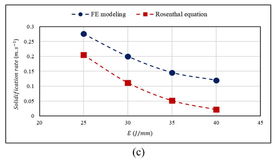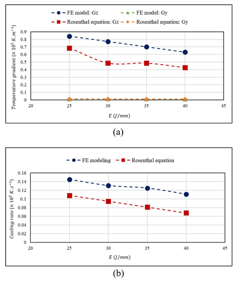 Temperature gradients are determined for different heat inputs using the numerical modeling and the analytical method, and the results obtained from the numerical modeling are compared with those attained from the analytical Rosenthal equation as shown in Figure 9, where the welding velocity is constant and its value is about 2 . As shown in Figure 9a, the temperature gradient is decreased by increasing heat input of the laser beam; this trend is the same for both approaches including the numerical modeling and the analytical method. The reason may lie in that by increasing the heat input of the laser beam, the molten pool becomes larger, which deteriorates the temperature gradient within the weld pool. According to the parameters used in this study, the results for temperature-dependent parameters such as temperature gradient, cooling rate, and growth rate obtained from the numerical modeling are slightly bigger than those from the analytical Rosenthal equation, as shown in Figure 9a–c.