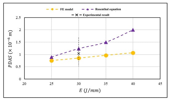 Variation of primary dendrite arm spacing (PDAS) obtained from the experiment, the numerical modeling, and the analytical method versus heat input.