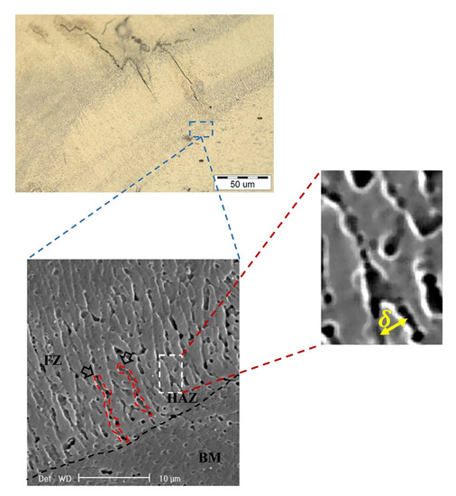 Figure 7 demonstrates a comparison made on the partially melted zones thickness obtained from the experiments, the FE modeling, and the Rosenthal equation as well as a cross-section of the molten pool, whose parameters were selected from A1 in Table 2, fitted by the FE model of the partially melted zone. As shown in Figure 6, the partially melted zone thickness obtained from the experiments increases when the heat input of the laser beam is augmented. Actually, the partially melted zone (PMZ) is an area formed between the eutectic (or solidus temperature for solutionized work pieces) and liquidus temperatures of materials [29]. It is reported that the energy density can only affect the PMZ length during welding [30]. According to the predicted results from the FE modeling, it is obvious that the partially melted zone thickness enhances with the heat input increment; however, these results overestimate the length of PMZ due to the simplifications described above, such as insulating of substrate walls and neglecting the existence of convection inside the melt pool. Regarding the results obtained from the analytical method, an overestimation of the experimental results can be seen from Figure 7. As described above, there were some assumptions performed to the Rosenthal equation with which the predicted results are not matched with the experimental ones in this regard.