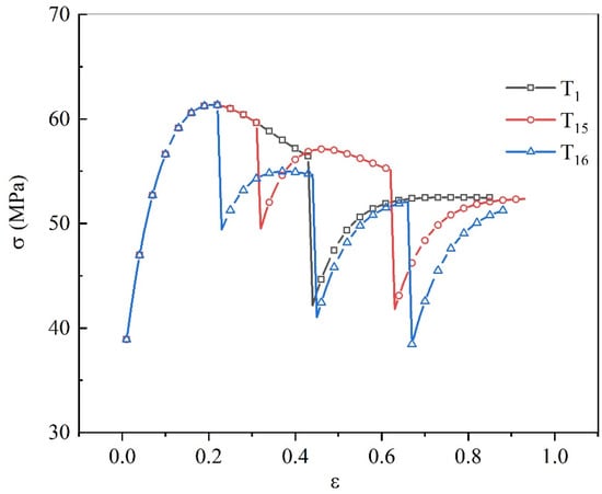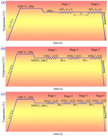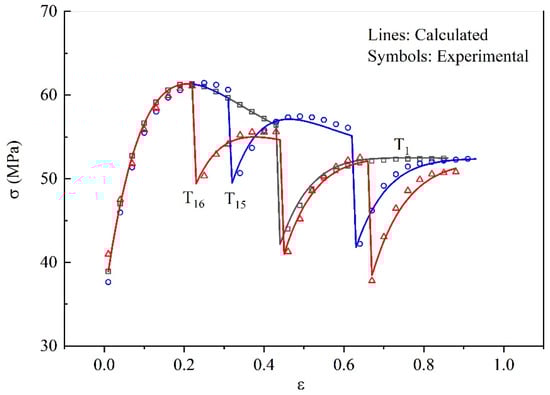 The triple-pass compression (T15) and quadruple-pass compression (T16) were carried out. The heating and holding process of triple-pass and quadruple-pass compression was the same as single-pass compression, but the deformation process was different. In the triple-pass compression, the strain rate, temperature, strain, and inter-pass holding time were set as 0.01 s−1, 1050 °C, 0.31, and 30 s, respectively. In the quadruple-pass compression, the parameters were set as 0.01 s−1, 1050 °C, 0.22, and 30 s, respectively. The experimental procedures are illustrated in Figure 1b,c. The stress–strain curves were smoothed by sampling stress at an interval strain of 0.01.