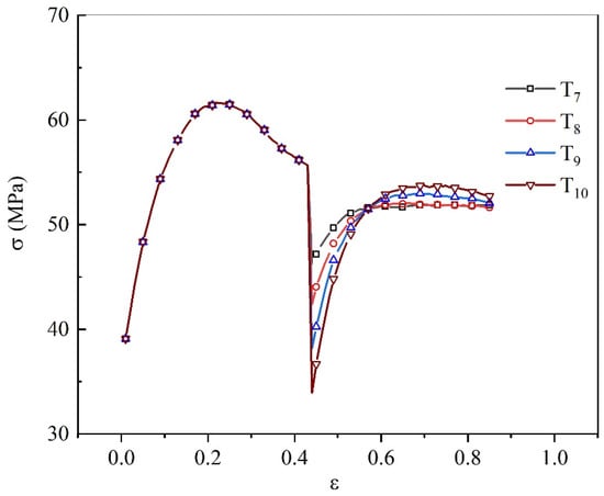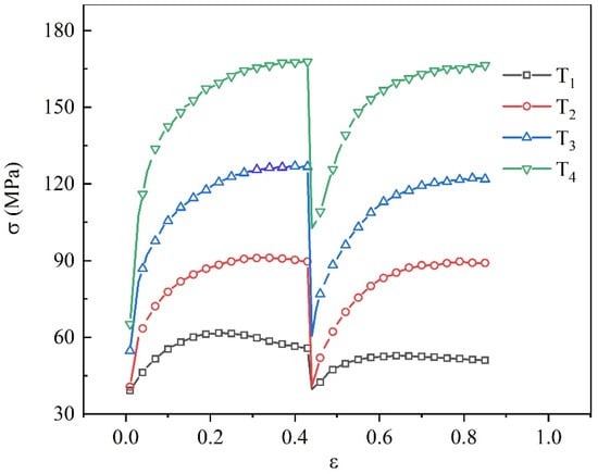 Stress–strain curves in double-pass compression under different temperatures ( = 0.01 s−1, = = 0.43, = 30 s).