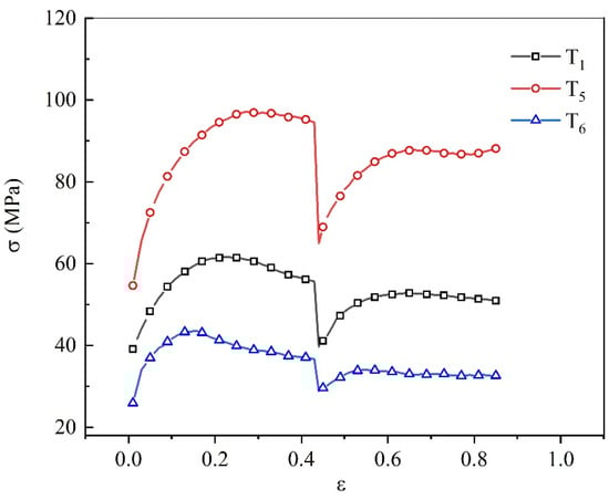 The stress–strain curves in double-pass compression under different temperatures are shown in Figure 3. Stress decreased with increasing temperatures (T5→T1→T6). This was because the dynamic recovery softening effect was more intense at higher temperatures. Different stress–strain curve shapes of the two passes were found in test T5 and T6. In the test of T6, the deformation was interrupted when dynamic recrystallization was fulfilled for a large proportion. Therefore, in the inter-pass holding, meta-dynamic recrystallization dominated. However, in the test of T5, dynamic recrystallization occurred incompletely, and in the holding, static recrystallization dominated. The meta-dynamic and static recrystallization volume fraction in inter-pass holding was determined by the dynamic recrystallization volume fraction in the first pass. The initial stress of the second pass was slightly higher and the peak stress was lower, which was consistent with the result in Figure 2. An early occurrence of dynamic recrystallization of the second pass of test T6 was facilitated by the deformation stored energy in the first pass.