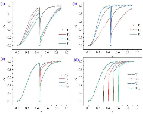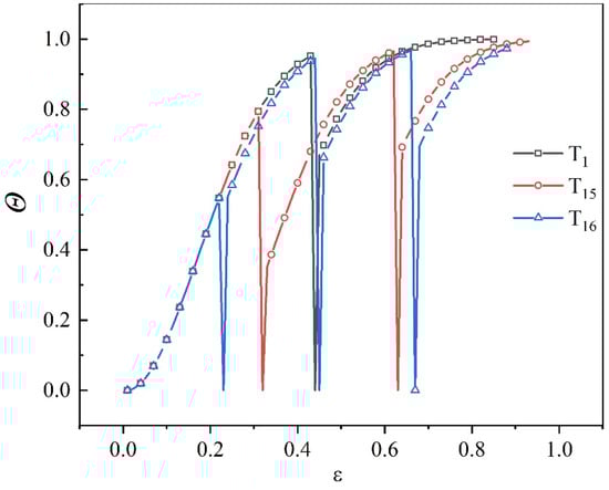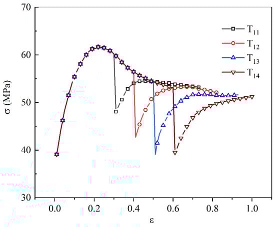The stress–strain curves in double-pass compression under different interrupt strains are shown in Figure 5. The curve of the first pass was dynamic recrystallization type, and the interrupt strain from T11 to T14 located in the downward section of the stress–strain curve, indicating that the dynamic recrystallization volume fraction from T11 to T14 was gradually increasing before interrupting. As the interrupt strain increased (T11→T14), both the initial stress and the peak stress of the second pass decreased. This was because the larger the interrupt strain, the higher the first pass recrystallization volume fraction, and the more obvious the softening effect on the second pass compression.