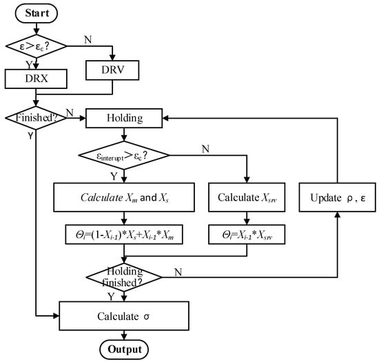 where , , , , , were all material constants. t was the inter-pass holding time. Otherwise, if the strain exceeded the critical strain, dynamic recrystallization, and dynamic recovery happened. The volume fraction of the dynamic recrystallized grains in total grains (X) was expressed as [18]: