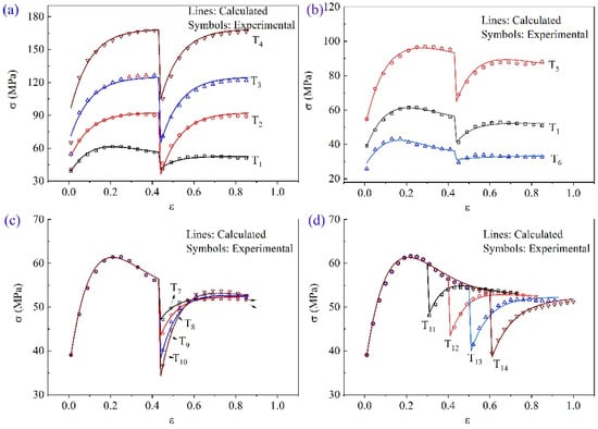 where were the experimental flow-stress, and was the calculated flow-stress. For genetic algorithm, the optimized parameters could be obtained simply by providing the parameter ranges, for example, from to , but the drawback was the optimization speed. For none-derivative method, the optimization could be much quicker, but an initial solution needed to be set. Therefore, to speed up the solving process, the model parameters were first identified by genetic algorithm. Then, the combination of model parameters was set as initial solution for none-derivative method. Twenty-one of the parameters were solved first by the stress–strain curves of test T1–T6, and 13 of the parameters were solved by the stress–strain curve of T7–T14. The optimized model parameters are shown in Table 2.