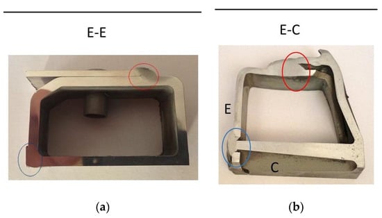 Indeed, for the E-C coupling, the HV values confirmed the results of the tests conducted on the other two combinations and the E-C frame case studied. In particular, it was confirmed that the extruded component (Si~1%) better conducted the heat produced during welding, resulting in a reduced change in hardness [58,59,60]. Looking at the hardness profiles, considerations similar to E-E and E-C can be advanced for extrusion-welding and casting-welding interfaces, respectively. With regard to the HRF hardness test, the typical evolution was obtained, with an initial HRF peak in the PMZ, a subsequent decrease, and a gradual restoration of the properties as distance increased. It is worthwhile also noting that the HRF profile demonstrated the difference in heat exchange between the cast and extruded component during welding.