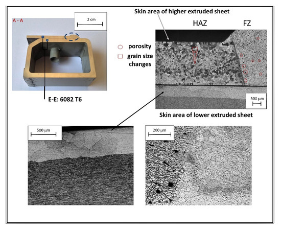 The EN AC 42100-T6 alloy microstructure is a typical example of an Al–Si alloy from a foundry. Cast alloys usually contain more alloying elements, therefore cooling can be quite long and a coarse-grained dendritic structure can be achieved. Like all foundry materials, it suffers from the presence of micro- and macro-segregation. Figure 7a shows the dendritic microstructure of the EN AC 42100-T6 BM, the large white dendrites (α-Al), and dark Al–Si eutectic in the space between the grains. Additionally, in this figure, it is possible to note some large shrinkage porosity, a frequent defect in the observed cast samples. In Figure 7b, the clear difference between the HAZ and FZ of the cast component side is highlighted. The PMZ was about 200–300 μm long. It should be also noted that during solidification, the material tends to also maintain a crystallographic continuity in the interface zone; in fact, the dendrites in the PMZ are developed starting from those already present in the cast. The microstructures at the interface between E-E and E-C are visible in Figure 3 and Figure 4, respectively. Figure 3 reports the particular structure observed at the interface between the extruded material and the FZ. Starting from the extruded grains, the following changes occurred in the metallurgical structure: first planar, then cellular, and finally dendritic. These microstructural changes are a consequence of the growth rate effect at the solidification front. Moreover, the Keller etch highlighted two remarkably different structures on the extruded parts. In the upper one, the structure had coarse equiassic grains close to the outer side of the extrusion and was gradually thinner toward the center; the lower part had a completely different microstructure, probably due to the different reduction ratios and extrusion parameters. It is important to note that in both laminas, there was a skin zone on the outer faces.