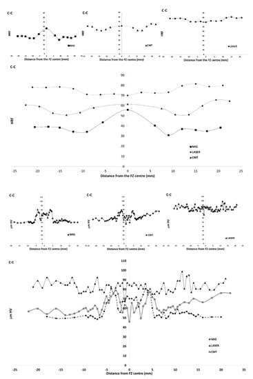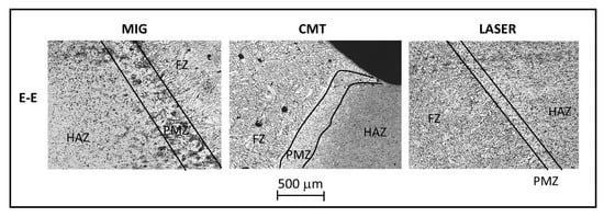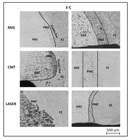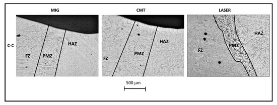 For the C-C combination (Figure 8) the PMZ for the MIG and CMT techniques had a regular evolution and covered about 200–300 μm and 500 μm of the interface area, respectively. It should also be noted that the PMZ for the laser weld had an irregular profile and this area was smaller but had longer dendrites.
