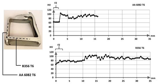 Macro-hardness Rockwell scale F (HRF) was performed along a planar section of the welded joint while micro hardness Vickers (HV) was performed on the cross section of the welds. Hardness profiles were obtained by measuring the hardness at regular distances starting from the center of the weld and moving forward the base metal. For HRF measurements, a hardness tester Rockwell Rupac 500Mra (Rupac srl Milano, Italy) with a 1.58 mm steel ball indenter diameter, load of 588 N (60 Kgf), and dwell time of 15 s was used, following the ASTM E 18-03 procedures [51]. At least three measurements were made and the average value was then considered. Vickers microhardness tests were carried out under 2.94 N (0.3 Kgf) load applied for 15 s by means of a Mitutoyo HM-200 hardness testing machine (Mitutoyo Italiana srl, Lainate, Italy, according to ASTM E92-16 [52] and ASTM E140-02 [53]. The microhardness profile was obtained in the center of the cross section after preliminary analyses confirming that the effect of the position was negligible for all three couplings of materials. The BM hardness was assumed to be 66 HRF, 65–70 HV for the 6xxx-T6 extrusion and 77 HRF, 85–90 HV for the EN AC 42100-T6 casting [54].