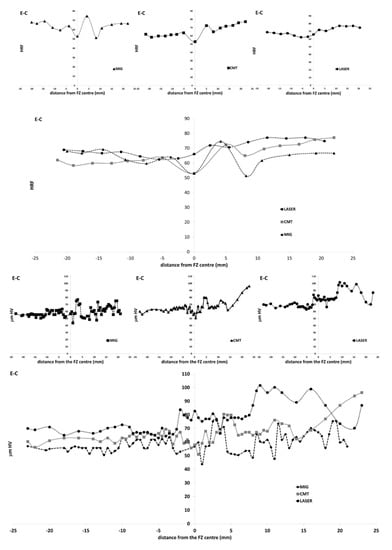 Evolution of the macro-hardness HRF and micro-hardness HV in the E-C combination of the weld for laser, CMT, and MIG.