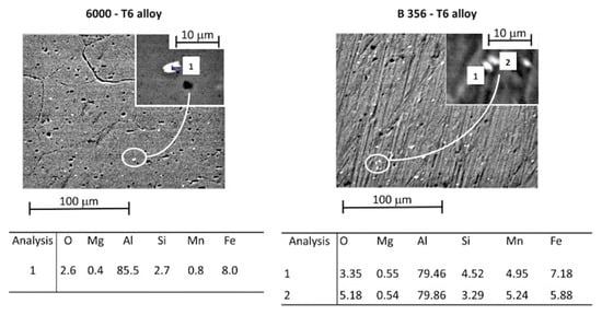 The PMZ and HAZ are crucial areas in weld alloys that are hardened by artificial aging. The transformation phase along the welding profiles was explained in the previous section. In addition, in the literature [55,56], it is documented that the microstructure of the welded Al–Si alloys is characterized by the presence of elongated particles (dimensions of about 1–10 μm) and extremely fine particles (size approximately of 0.1–0.5 μm) dispersed in a matrix with uniformly distributed micropores. This is remarkable, since it has been reported that Si-rich precipitates are found due to the excess silicon in the alloys. The larger particles were identified as the (Fe, Mn)3SiAl12 compound, while the finer ones were Mg2Si, the hardening phase obtained during thermal treatment (T6).