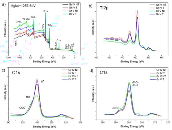 (a) General spectrum; (b) regions of Ti2p; (c) O1s; (d) C1s; grade IV untreated (TiIVNT) black line; grade IV treated (TiIVT) red line; grade V untreated (TiVNT) green line; and grade V treated (TiVT) blue line.