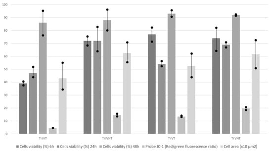 In the flow cytometry with JC-1, the red/green ratio is greater for the osteoblasts adhering to the TiVNT and TiIVNT discs than for the corresponding TiVT and TiIVT, indicating a better energy balance of the cells adhered to them; in the case of TiIVTR, we observed a reduced ratio, which suggests greater oxidative damage.