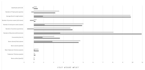 On comparing the data obtained from the BoneJ trabecular analysis plugins, no statistically significant differences were observed for numerous variables across the different implants, except for Average Branch Length (p < 0.05). However, groups with treated surfaces showed a better tendency in relation to bone behavior (Table 3 and Figure 4).