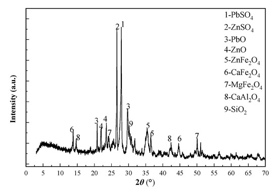 The sample was collected from the Pb-Zn sulfide ore dressing plant by the flotation-oxidizing roasting process. The oxidizing roasting cinders contained 16.9% Pb, 30.5% Zn, 10.3% Fe and 25.1% S. Anglesite (PbSO4) and lead oxide (PbO) were the main Pb-bearing minerals, while zinc sulfate (ZnSO4), zinc oxide (ZnO) and zinc ferrite (Zn2FeO4) were the main Zn-bearing minerals. Gangue minerals were quartz (SiO2), calcium ferrite (CaFe2O4), magnesium ferrite (MgFe2O4), calcium aluminate (Ca2Al2O4), etc. The chemical composition analysis of the sample is shown in Table 1. The lead and zinc mineral phase analyses for the main elements are shown in Table 2 and Table 3, respectively, while a size fraction is shown in Table 4, and the X-ray diffraction (XRD, X Pert pro, Panaco, the Netherlands) analysis is shown in Figure 2.