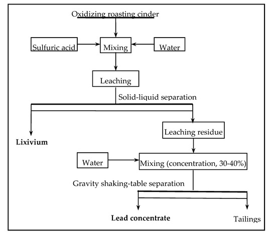 - A sulfuric acid leaching—gravity shaking-table separation process was used to recover lead and zinc from the oxidizing roasting cinder. The zinc leaching efficiency of 96.7% was obtained under the leaching conditions used: a leaching temperature of 55 °C; a leaching time of 90 min; a sulfuric acid dosage of 20%; a sulfurous acid dosage of 4%; a cinder particle size of <0.3 mm; and a solid-liquid ratio of R = 1:4. After the gravity shaking-table separation, a lead concentrate with 50.2% Pb, 2.33% Zn and a lead recovery of 86.0% was produced.
