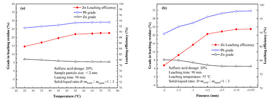 Effect of leaching temperature (a) and fineness (b) on the leaching efficiency of zinc and the metal grades in the leaching residue.