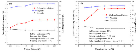 The test results of different solid-liquid ratios are shown in Figure 6a. Once the solid-liquid ratio reached 1:4, the viscosity of the leaching solution changed little. Hence, diffusion rates of species to and from the reacting mineral surfaces did not increase significantly with the further decrease of the solid-liquid ratio. Hence, the leaching efficiency increased slowly. A solid-liquid ratio for the leaching of R = 1:4 was therefore suitable. The leaching efficiency of zinc was 91.4%, the lead grade was enriched to 32.8%, and the zinc grade was reduced to 5.08% in leaching residue.