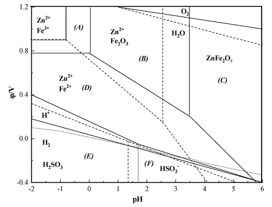 The effects of different sulfurous acid dosage are shown in Figure 6b. The mineral analysis of the sample indicated the presence of ZnFe2O4, which does not readily react with sulfuric acid to produce ZnSO4 and Fe2(SO4)3 during the leaching process. Combining this with the previous relevant study, the addition of oxidizer in the leaching process was beneficial to improve the leaching efficiency. The predominance diagram of φ-pH for the SO2-ZnFe2O4-H2O system at different temperatures is shown in Figure 7. There are two mechanisms for the decomposition of ZnFe2O4 under acidic conditions. Under the oxidizing conditions, the first step of ZnFe2O4 decomposition is into Fe2O3 and Zn2+, and the second step is Fe3+ dissolution from Fe2O3. Under the reducing conditions, after ZnFe2O4 is decomposed into Fe2O3 and Zn2+, Fe2O3 is reductively dissolved to Fe2+. When the redox potential was controlled in the (B) region, zinc in ZnFe2O4 entered the solution in the form of Zn2+, while iron remained in the residue in the form of Fe2O3. When the redox potential was controlled in the (D), (E) and (F) regions, zinc and iron in ZnFe2O4 entered the solution in the form of Zn2+ and Fe2+, respectively [17,18,19,20].