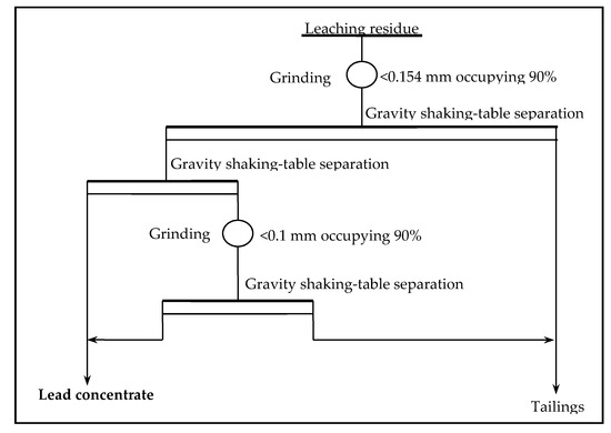 Gravity shaking-table separation was adopted to further recover lead from the acid leaching residue, and the test procedure is shown in Figure 8. The test results are shown in Table 7, and the main element analysis results for the lead concentrate generated are shown in Table 8. The lead concentrate with a lead grade of 50.2% and recovery of 86.0% was obtained by two stages of grinding and three stages of gravity shaking-table separation. According to the quality standard for lead concentrate in China, the lead concentrate meets the requirement for level four lead concentrate, with a lead content of more than 50%.