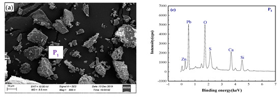 XRD, scanning electron microscopy (SEM) and energy dispersive X-ray (EDS) are used to characterize the leaching residue and lead concentrate, and analyze the leaching mechanism of sulfuric acid system solution. SEM-EDS analysis results of leaching residue and lead concentrate are shown in Figure 9, and XRD analysis results for leaching residue and lead concentrate are shown in Figure 10.