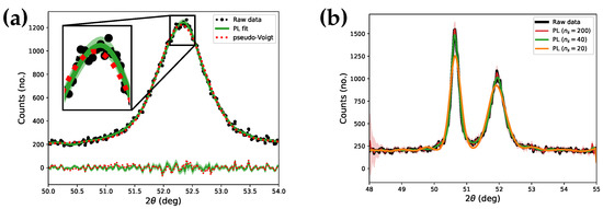 Figure 1a shows an example of PL smoothing and is compared to a pseudo-Voigt fit, which shows these fits to be of comparable performance. An important intrinsic feature about the PL method is that you can obtain a confidence interval, shown as the green bands on Figure 1a, yielding a statistical measure of the goodness of fit (see Supplemental Information). Since the smoothing method employed is based on the use of B-splines, care must be taken to choose the proper number of spline segments (). Figure 1b shows the resulting fits for three values. If too few segments are used, the splines are unable to properly approximate the XRD pattern. However, including too many segments will lead to an over fitting of the curve. To determine the optimal number of segments, the mean square error (MSE) and Pearson-correlation were calculated as a function of (see Supplemental Information Figure S1). It can be seen that for both these metrics begin to plateau, meaning that little information is gained from increasing . It is shown that the PL method tends to perform badly when fitting at the diffraction angle extremes, especially when the data is overfit (i.e., ). This is likely a result of trying to extrapolate an overfit B-spline of a noise prone signal.