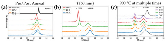 In situ XRD measurements were performed at different anneals, showcasing the instantaneous microstructural state. (a) pre (dashed) and post (solid) annealed alloys at RT showing the presence of FeNiZr (bulk Fe reference was simulated with VESTA [44]), (b) after 60 min holds at the corresponding temperatures, and (c) 900 C anneal illustrating the nucleation and evolution of the phase.