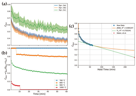 Approximation of the retained phase at different hold times. (a) different methods were tested to determine which method is more reliable, (b) the resulting phase evolution at the different isothermal conditions, and (c) fit to the 900 C estimated phase evolution, which is compared to the result by Kotan et al. The linear fit was performed using the last 17 min of the current data.